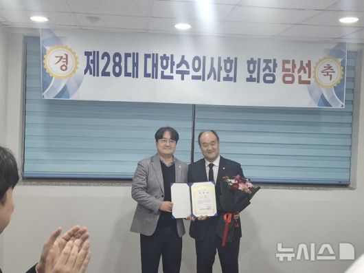 [서울=뉴시스] 김은석 대한수의사협회 선관위원장과 우연철 당선인. (사진= 대한수의사협회 제공) |