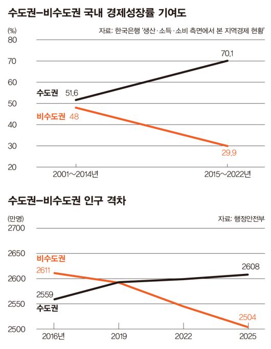 수도권 인구는 2019년 2593만 명이 되면서 처음으로 비수도권(2592만 명)을 앞서 2025년 100만 명 이상 차이로 벌어졌다. 그런데 경제에서 차지하는 비중은 그 차이를 훨씬 뛰어넘는다. 2024년 3월 한국은행이 낸 ‘생산·소득·소비 측면에서 본 지역경제 현황’을 보면 수도권의 경제성장률 기여도는 2001~2014년 51.6%에서 2015~2022년 70.1%로 현격히 높아졌다.