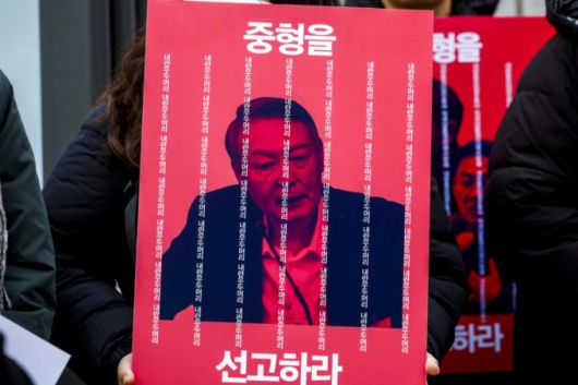 15일 서울 서초구 서울중앙지방법원 앞에서 열린 윤석열 중형 촉구 서명 및 의견서 제출 기자회견에서 참여연대 및 민주사회를 위한 변호사모임 관계자들이 피켓을 들고 있다./사진=뉴시스 |