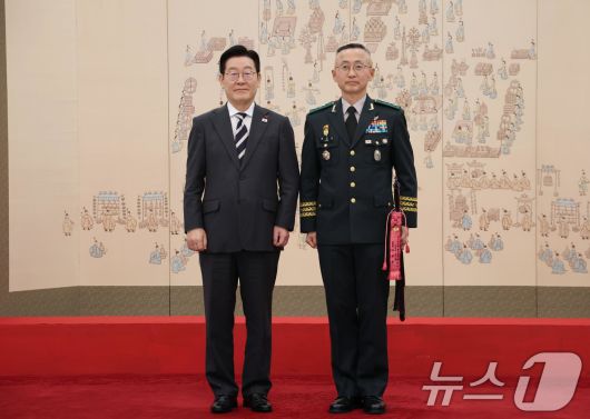 (서울=뉴스1) 허경 기자 = 이재명 대통령이 16일 청와대 본관에서 열린 3성 장군 진급·보직 신고 및 수치 수여식에서 최성진 제7군단장과 기념촬영을 하고 있다. 2026.1.16/뉴스1