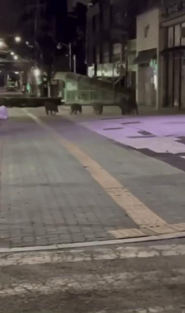 일대에서 한 시민이 촬영한 영상을 보면 성체 2마리와 새끼 3마리 등 멧돼지 5마리가 횡단보도와 인도를 줄지어 돌아다니는 모습이 담겨있다.