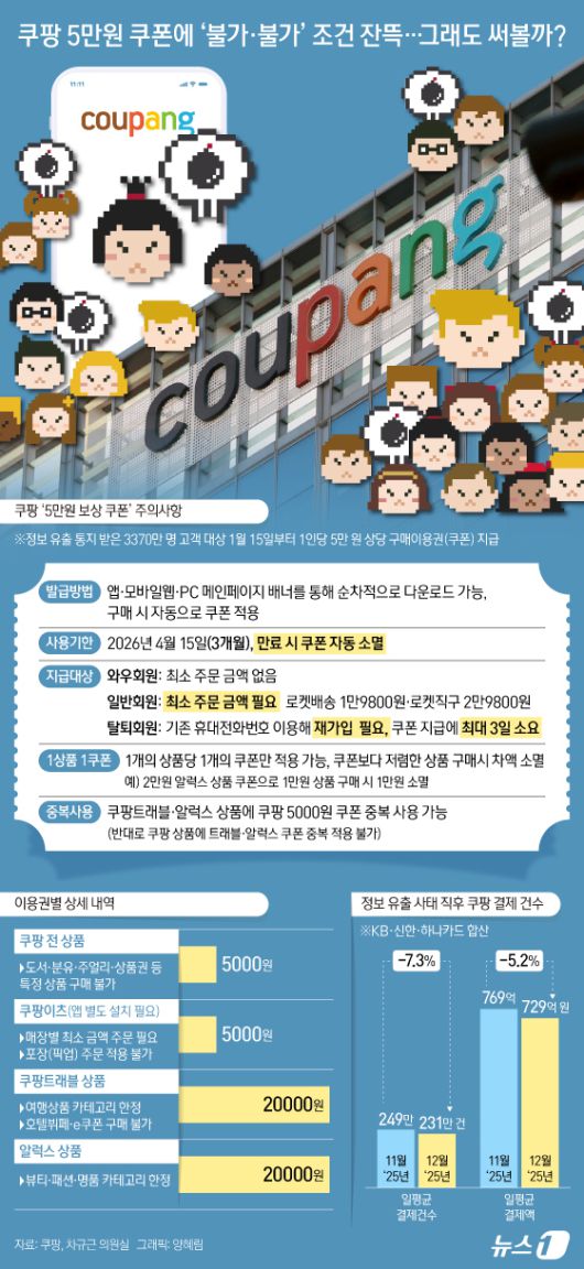 (서울=뉴스1) 양혜림 디자이너 = 16일 업계에 따르면 쿠팡은 15일부터 정보 유출 통지를 받은 3370만 고객을 대상으로 1인당 5만 원 구매이용권에 대한 순차적 지급에 나섰다. 쿠팡 측은 "발급 규모가 큰 만큼 쿠폰 사용 오류 점검 등을 고려해 일괄이 아닌 순차적으로 지급하며, 고객마다 지급일이 다를 수 있다"고 말했다. 쿠팡 공지에 따르면 구매이용권 관련 사용 조건 안내만 22개다. 핵심적인 부분을 보면 쇼핑과 쿠팡이츠 5000원, R.LUX 뷰티&패션과 쿠팡 트래블 2만 원 등이다. 와우·일반회원·탈퇴회원 모두에 지급되지만 탈퇴회원의 경우 재가입해야 하며 승인까지 72시간이 소요된다. 사용 기간은 4월 15일(3개월)까지로 제한했으며 쿠팡 상품(도서·분유주얼리·상품권 등), 쿠팡트래블(호텔뷔페·E쿠폰 등)도 제외된다.