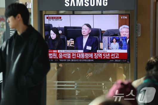 (서울=뉴스1) 이광호 기자 = 16일 오후 서울역에서 시민들이 체포 방해와 국무위원 심의권 침해 등 혐의로 기소된 윤석열 전 대통령에 대한 1심 선고 생중계를 지켜보고 있다. 2026.1.16/뉴스1