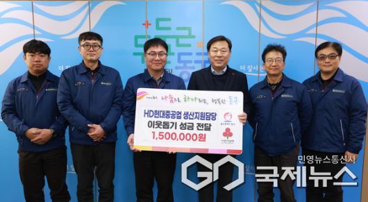 (울산=국제뉴스) 주영곤 기자 = HD현대중공업 생산지원담당(부서장 박필용 수석)은 16일 동구청을 방문해 '이웃돕기 성금 150만 원'을 전달했다.