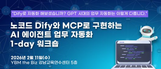 전자신문인터넷, 케이모바일이 주관하는 노코드 Dify와 MCP로 구현하는 AI 에이전트 업무 자동화 1-day 워크숍”이 2월 11일(수) YBM the Biz 강남교육연수센터에서 개최된다.