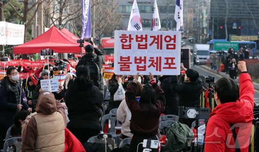 (서울=뉴스1) 김진환 기자 = 윤석열 전 대통령의 고위공직자범죄수사처(공수처) 체포영장 집행 방해 및 국무위원 심의권 침해 혐의 1심 선고 재판이 열린 16일 오후 서울 서초구 서울중앙지법 앞에서 윤 전 대통령 지지자들이 구호를 외치고 있다. 서울중앙지법 형사합의35부(부장판사 백대현)는 이날 윤 전 대통령에 징역 5년을 선고했다. 2026.1.16/뉴스1