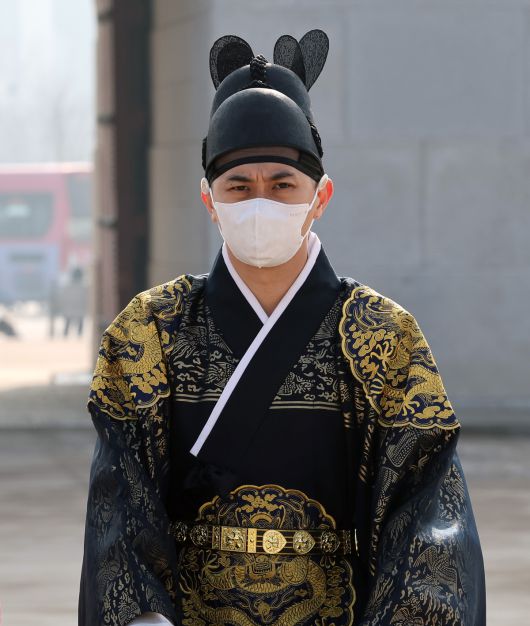 마스크를 착용한 한 외국인 관광객이 16일 서울 경복궁을 둘러보고 있다. 서울시는 이날 오전 11시 기준 초미세먼지 주의보를 발령했다.올해 첫 초미세먼지 주의보 발령이다. |