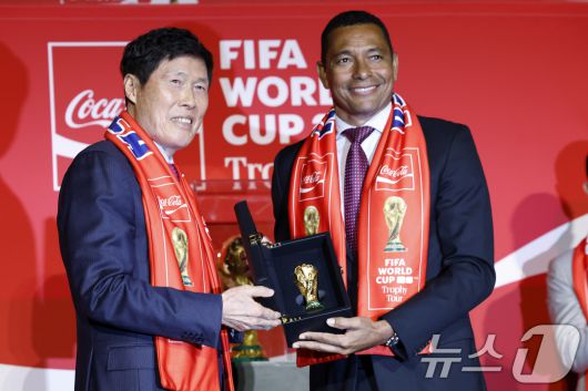 (서울=뉴스1) 박정호 기자 = 16일 오후 서울 용산구 한강대로 CGV 용산아이파크몰 스크린X관에서 열린 FIFA 월드컵 트로피 투어 미디어 간담회에서 FIFA 글로벌 홍보대사이자 전 브라질 축구 국가대표 지우베르투 시우바(Gilberto Silva)가 한국 축구 레전드 차범근 전 감독에게 FIFA 트로피 레플리카를 전달하고 있다. 2026.1.16/뉴스1