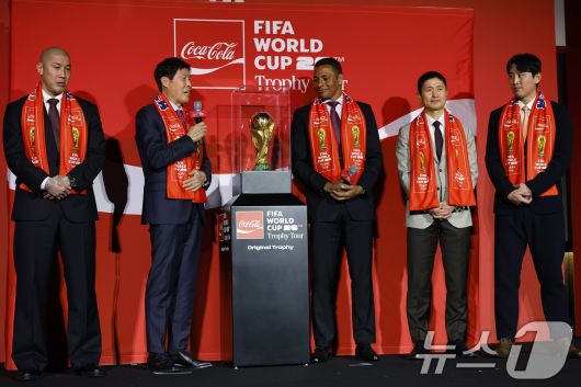 (서울=뉴스1) 박정호 기자 = 한국 축구 레전드 차범근 전 감독(왼쪽 두 번째)이 16일 오후 서울시 용산구 한강대로 CGV 용산아이파크몰 스크린X관에서 열린 FIFA 월드컵 트로피 투어 미디어 간담회에서 월드컵 트로피에 대한 감정을 솔직하게 밝히고 있다. 2026.1.16/뉴스1