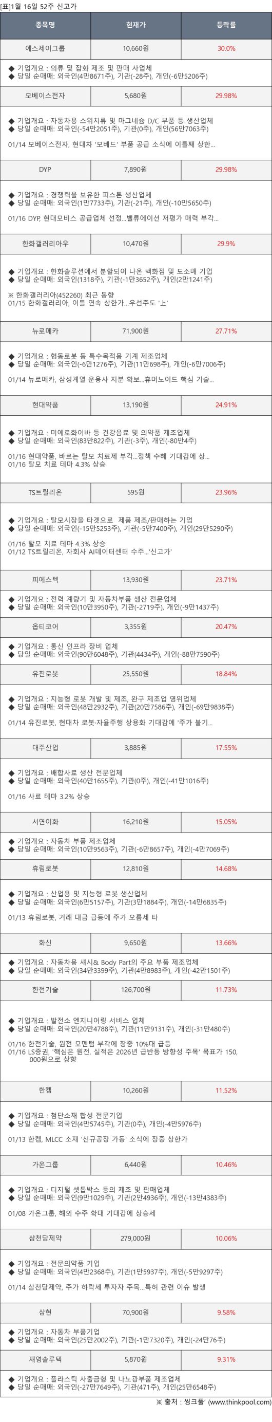 [서울=뉴스핌] 로보뉴스 = 1월 16일, 인공지능 투자비서 ‘AI라씨로’가 52주 신고가가 발생한 에스제이그룹(306040), 모베이스전자(012860) 등에 대해 최근 동향을 분석했다.