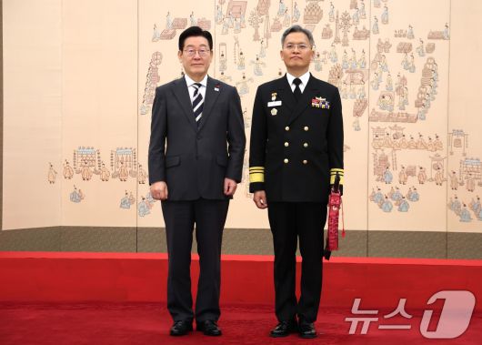 (서울=뉴스1) 허경 기자 = 이재명 대통령이 16일 청와대 본관에서 열린 3성 장군 진급·보직 신고 및 수치 수여식에서 곽광섭 해군참모차장과 기념촬영을 하고 있다. 2026.1.16/뉴스1