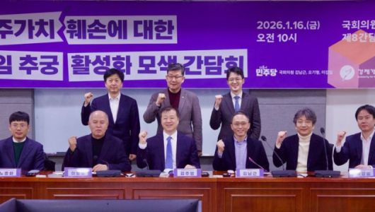 민주당 코스피5000특별위원회 소속 김남근·오기형·이강일 의원실은 16일 국회 의원회관에서 ‘주주가치 훼손에 대한 민사책임 추궁 활성화 모색 간담회’를 개최했다. 김 의원은 “대선 때 한국형 디스커버리 제도를 공약했다. 주주와 대기업 사이 증거개시제도는 실제로 민사책임을 활성화하는 데 역할을 할 것이라고 생각한다”며 “올해는 본격적으로 관련 법을 개정해 나갈 예정”이라고 말했다.