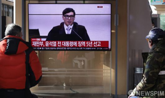 [서울=뉴스핌] 양윤모 기자 = 16일 오후 특수공무집행방해, 직권남용 권리행사방해 등 혐의로 기소된 윤석열 전 대통령에게 서울중앙지법 형사합의35부(백대현 부장판사)가 1심에서 징역 5년을 선고한 가운데, 서울역 대합실을 찾은 시민들이 관련 뉴스를 시청하고 있다. 2026.01.16 yym58@newspim.com