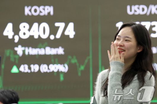 (서울=뉴스1) 김명섭 기자 = 코스피 종가가 사상최고치를 기록한 16일 오후 서울 중구 하나은행 본점 딜링룸 전광판에 증시 종가 시황이 나타나고 있다. 이날 코스피 지수는 전거래일 대비 43.19(0.90%) 포인트 상승한 4,840.74로, 코스닥지수는 3.43(0.36%)포인트 상승한 954.59로 장을 마감했다. 2026.1.16/뉴스1