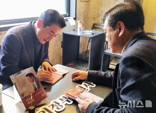 [의정부=뉴시스] 김도희 기자 = 김동근 경기 의정부시장이 16일 청년 소상공인이 운영하는 지역의 한 카페에서 저서 '의정부 해결사' 출판기념회 개최했다.