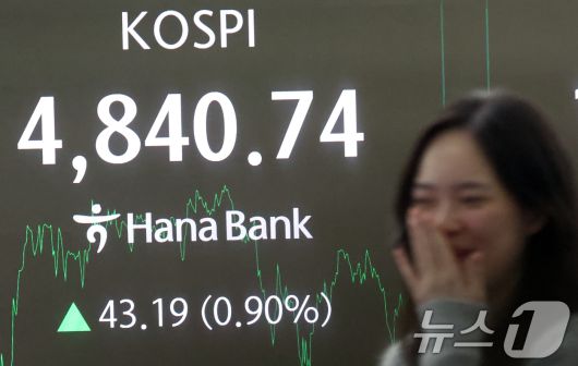 (서울=뉴스1) 김명섭 기자 = 코스피 종가가 사상최고치를 기록한 16일 오후 서울 중구 하나은행 본점 딜링룸 전광판에 증시 종가 시황이 나타나고 있다. 이날 코스피 지수는 전거래일 대비 43.19(0.90%) 포인트 상승한 4,840.74로, 코스닥지수는 3.43(0.36%)포인트 상승한 954.59로 장을 마감했다. 2026.1.16/뉴스1