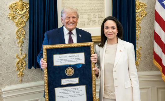 베네수엘라 야권 지도자 마리아 코리나 마차도가 15일(현지 시간) 미국 워싱턴 백악관을 방문해 자신이 지난해 받은 노벨평화상 메달을 도널드 트럼프 미 대통령에게 선물했다. 이에 대해 트럼프 대통령은 이날 자신의 소셜미디어 트루스소셜에 “상호존중을 보여주는 제스처였다”며 “고마워요 마리아(Thank you María)!”라고 화답했다. 니콜라스 마두로 베네수엘라 대통령 실각 후 대권을 노리는 마차도가 ‘트럼프 환심사기’에 나섰다는 지적이 나온다.