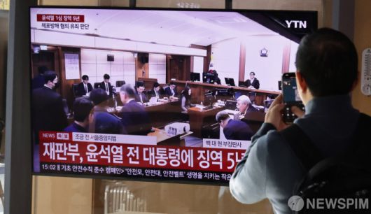 [서울=뉴스핌] 양윤모 기자 = 16일 오후 특수공무집행방해, 직권남용 권리행사방해 등 혐의로 기소된 윤석열 전 대통령에게 서울중앙지법 형사합의35부(백대현 부장판사)가 1심에서 징역 5년을 선고한 가운데, 서울역 대합실을 찾은 시민이 관련 뉴스를 휴대폰으로 촬영하고 있다. 2026.01.16 yym58@newspim.com |
