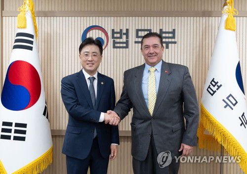 (서울=연합뉴스) 이진수 법무부 차관이 16일 정부과천청사 법무부에서 살리 무랏 타메르 주한 튀르키예 대사와 만나 악수하고 있다. 2026.1.16 [법무부 제공. 재판매 및 DB 금지]