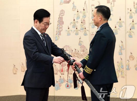 (서울=뉴스1) 허경 기자 = 이재명 대통령이16일 청와대 본관에서 열린 3성 장군 진급·보직 신고 및 수치 수여식에서 최장식 육군참모차장의 삼정검에 수치를 달아주고 있다. 2026.1.16/뉴스1seiyu@news1.krCopyright ⓒ 뉴스1. All rights reserved. 무단 전재 및 재배포, AI학습 이용 금지.