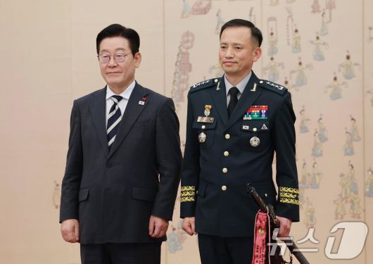 (서울=뉴스1) 허경 기자 = 이재명 대통령 16일 청와대 본관에서 열린 3성 장군 진급·보직 신고 및 수치 수여식에서 최장식 육군참모차장과 기념촬영을 하고 있다. 2026.1.16/뉴스1seiyu@news1.krCopyright ⓒ 뉴스1. All rights reserved. 무단 전재 및 재배포, AI학습 이용 금지.