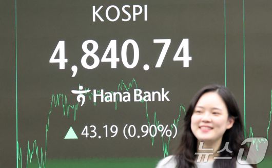 (서울=뉴스1) 김명섭 기자 = 코스피 종가가 사상최고치를 기록한 16일 오후 서울 중구 하나은행 본점 딜링룸 전광판에 증시 종가 시황이 나타나고 있다. 이날 코스피 지수는 전거래일 대비 43.19(0.90%) 포인트 상승한 4,840.74로, 코스닥지수는 3.43(0.36%)포인트 상승한 954.59로 장을 마감했다. 2026.1.16/뉴스1