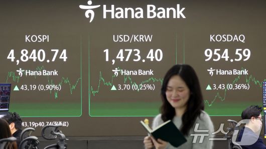 (서울=뉴스1) 김명섭 기자 = 코스피 종가가 사상최고치를 기록한 16일 오후 서울 중구 하나은행 본점 딜링룸 전광판에 증시 종가 시황이 나타나고 있다. 이날 코스피 지수는 전거래일 대비 43.19(0.90%) 포인트 상승한 4,840.74로, 코스닥지수는 3.43(0.36%)포인트 상승한 954.59로 장을 마감했다. 2026.1.16/뉴스1