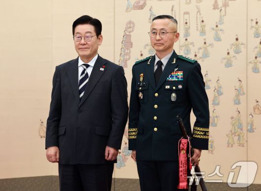 (서울=뉴스1) 허경 기자 = 이재명 대통령이 16일 청와대 본관에서 열린 3성 장군 진급·보직 신고 및 수치 수여식에서 최성진 제7군단장과 기념촬영을 하고 있다. 2026.1.16/뉴스1seiyu@news1.krCopyright ⓒ 뉴스1. All rights reserved. 무단 전재 및 재배포, AI학습 이용 금지.