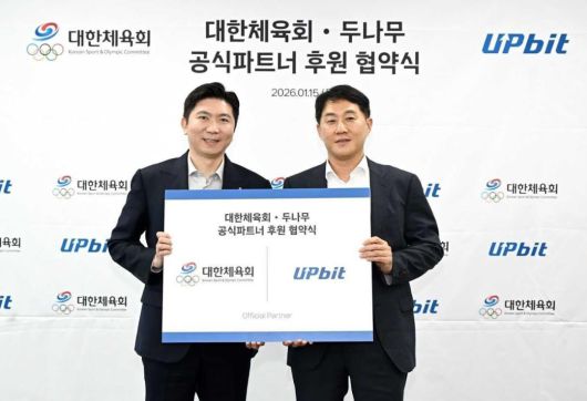 디지털자산 거래소 업비트를 운영하는 두나무(대표 오경석)는 지난 15일 대한체육회(회장 유승민)와 공식 파트너 후원 협약식을 개최했다고 16일 밝혔다. 협약식은 대한체육회에서 열렸으며, 오경석 두나무 대표와 유승민 대한체육회장을 비롯한 양측 관계자들이 참석했다.