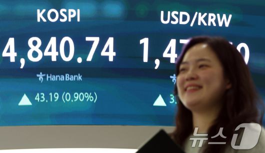 (서울=뉴스1) 김명섭 기자 = 코스피 종가가 사상최고치를 기록한 16일 오후 서울 중구 하나은행 본점 딜링룸 전광판에 증시 종가 시황이 나타나고 있다. 이날 코스피 지수는 전거래일 대비 43.19(0.90%) 포인트 상승한 4,840.74로, 코스닥지수는 3.43(0.36%)포인트 상승한 954.59로 장을 마감했다. 2026.1.16/뉴스1