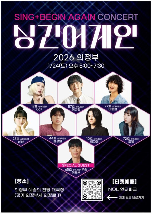 이어 24일 오후 5시에는 의정부 예술의전당 대극장에서 의정부 공연이 개최된다. 이 무대에는 10호 이자헌, 17호 067, 23호 산하, 44호 한성일, 57호 이규형, 72호 도빛, 77호 이동현이 출연해 풍성한 라인업을 선보인다. 특히 의정부 공연에는 싱어게인4 우승자인 65호 이오욱이 스페셜 게스트로 합류해 투어의 대미를 장식할 예정이다.