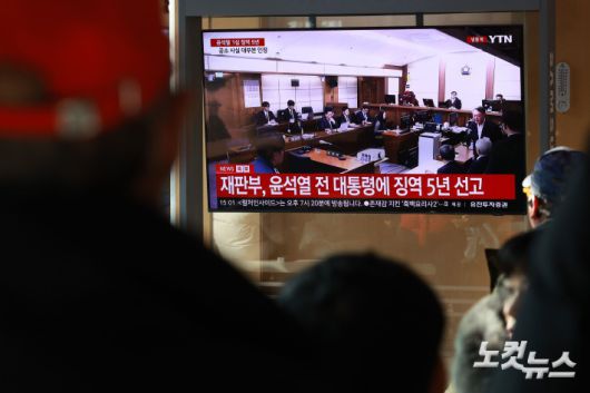 16일 오후 서울역 대합실에서 시민들이 고위공직자범죄수사처(공수처) 체포 방해 혐의 등으로 기소된 윤석열 전 대통령에 대한 1심 선고 공판 생중계를 지켜보고 있다.