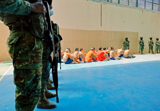 지난해 10월 에콰도르 과야킬의 제8구역 교도소에서 군인들이 수감자들을 감시하고 있다./AFP 연합 |