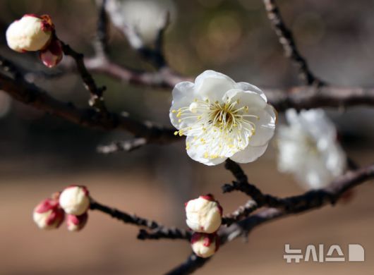 [서울=뉴시스] 류현주 기자 = 포근한 날씨를 보인 16일 부산 남구 동명대학교에서 '봄의 전령' 매화가 꽃망울을 터트려 눈길을 사로잡고 있다.