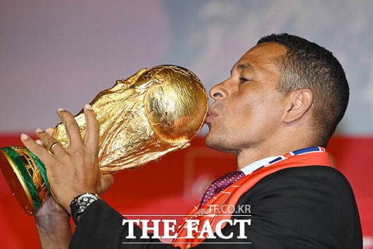 [더팩트ㅣ서예원 기자] 전 브라질 축구 국가대표 지우베르투 시우바가 16일 오후 서울 용산구 CGV 용산아이파크몰에서 열린 ‘FIFA 월드컵™ 트로피 투어 by 코카-콜라’ 미디어 간담회에 참석해 트로피에 입을 맞추고 있다.
