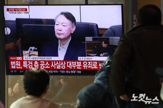 16일 오후 서울역 대합실에서 시민들이 고위공직자범죄수사처(공수처) 체포 방해 혐의 등으로 기소된 윤석열 전 대통령에 대한 1심 선고 공판 생중계를 지켜보고 있다.