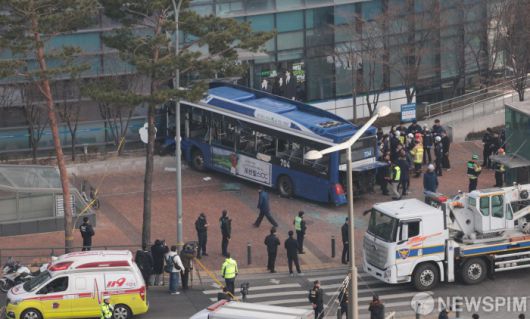 [서울=뉴스핌] 이길동 기자 =16일 오후 서울 서대문역 인근에서 시내버스가 인도와 건물로 돌진하는 사고가 발생해 경찰과 소방당국이 현장을 수습하고 있다.2026.01.16 gdlee@newspim.com