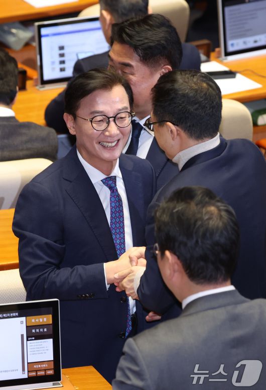 (서울=뉴스1) 신웅수 기자 = 전재수 더불어민주당 의원이 16일 서울 여의도 국회에서 열린 제431회 국회(임시회) 제1차 본회의에서 의원들과 대화하고 있다. 2026.1.16/뉴스1phonalist@news1.krCopyright ⓒ 뉴스1. All rights reserved. 무단 전재 및 재배포, AI학습 이용 금지.