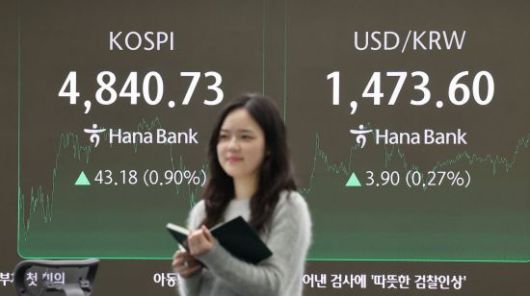 코스피가 사상 처음으로 4800대에서 장을 마친 16일 서울 중구 하나은행 딜링룸 현황판에 코스피지수 등이 표시돼 있다. 연합뉴스 |