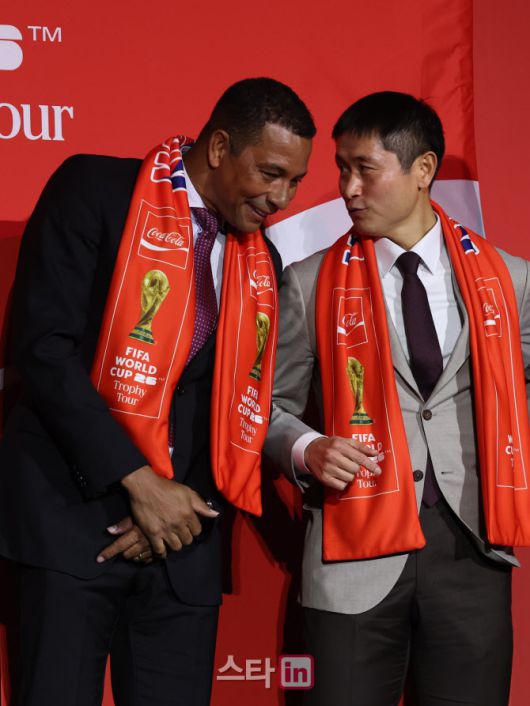 [이데일리 스타in 이영훈 기자] 16일 오후 서울시 용산구 한강대로 CGV 용산아이파크몰 스크린X관에서 열린 FIFA 월드컵 트로피 투어 미디어 간담회에서 FIFA 글로벌 홍보대사이자 전 브라질 축구 국가대표 지우베르투 시우바(Gilberto Silva)와 이영표가 대화를 나누고 있다.