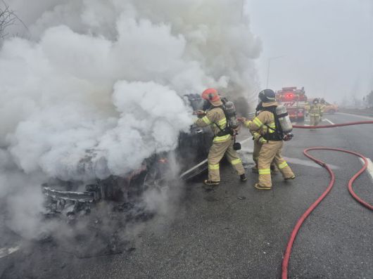 [예산=뉴시스] 16일 오전 9시50분께 대전당진고속도로 당진방향 예산 수덕사IC 톨게이트 200m 앞에서 스포츠유틸리티차량(SUV)에 불이 나 소방대원들이 진화에 나서고 있다. (사진=예산소방서 제공) 2026.01.16. photo@newsis.com *재판매 및 DB 금지 |