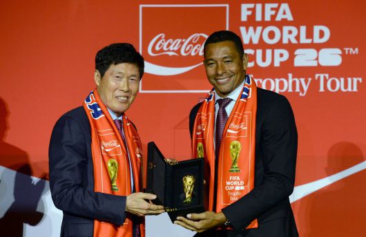 16일 서울 용산구 CGV용산아이파크몰에서 열린 FIFA 월드컵 트로피 투어 미디어 간담회에서 전 브라질 축구 국가대표 선수 지우베르투 시우바(오른쪽)가 차범근 전 감독에게 트로피 레플리카를 증정하고 있다. #김용학 기자 yhkim@sportsworldi.com ⓒ 스포츠월드