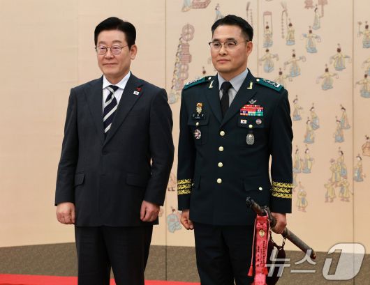 (서울=뉴스1) 허경 기자 = 이재명 대통령 16일 청와대 본관에서 열린 3성 장군 진급·보직 신고 및 수치 수여식에서 강관범 육군교육사령관과 기념촬영을 하고 있다. 2026.1.16/뉴스1seiyu@news1.krCopyright ⓒ 뉴스1. All rights reserved. 무단 전재 및 재배포, AI학습 이용 금지.