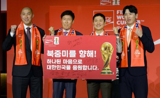 차두리 감독, 차범근 전 감독, 이영표해설위원, 구자철 레드앤풋볼 아시아 스포츠 디렉터(왼쪽부터)가 16일 서울 용산구 CGV용산아이파크몰에서 열린 FIFA 월드컵 트로피 투어 미디어 간담회에서 응원의 메시지를 전달하며 화이팅을 외치고 있다. #김용학 기자 yhkim@sportsworldi.com ⓒ 스포츠월드