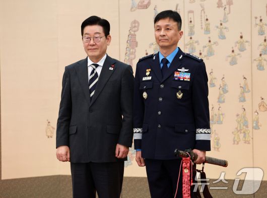 (서울=뉴스1) 허경 기자 = 이재명 대통령이 16일 청와대 본관에서 열린 3성 장군 진급·보직 신고 및 수치 수여식에서 권영민 공군교육사령관과 기념촬영을 하고 있다. 2026.1.16/뉴스1