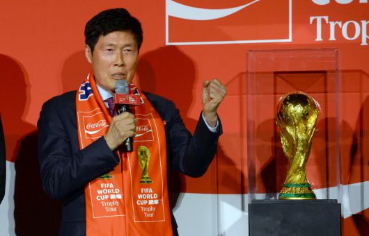 차범근 전 국가대표축구팀 감독이 16일 서울 용산구 CGV용산아이파크몰에서 열린 FIFA 월드컵 트로피 투어 미디어 간담회에서 화이팅을 외치고 있다. #김용학 기자 yhkim@sportsworldi.com ⓒ 스포츠월드