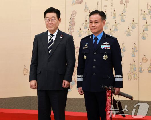 (서울=뉴스1) 허경 기자 = 이재명 대통령이 16일 청와대 본관에서 열린 3성 장군 진급·보직 신고 및 수치 수여식에서 김준호 국방정보본부장과 기념촬영을 하고 있다. 2026.1.16/뉴스1seiyu@news1.krCopyright ⓒ 뉴스1. All rights reserved. 무단 전재 및 재배포, AI학습 이용 금지.