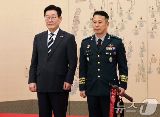 (서울=뉴스1) 허경 기자 = 이재명 대통령이 16일 청와대 본관에서 열린 3성 장군 진급·보직 신고 및 수치 수여식에서 정유수 제2군단장과 기념촬영을 하고 있다. 2026.1.16/뉴스1seiyu@news1.krCopyright ⓒ 뉴스1. All rights reserved. 무단 전재 및 재배포, AI학습 이용 금지.