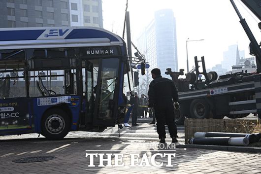 [더팩트 | 송호영 기자] 16일 오후 서울 서대문역 사거리에서 시내버스가 차도를 넘어 NH농협은행 건물로 돌진하는 사고가 발생한 가운데 사고 버스가 견인되고 있다.