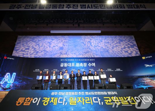 (광주=뉴스1) 박지현 기자 = 16일 오후 광주 서구 김대중컴벤션센터에서 강기정 광주시장과 국회의원, 공공기관장 등이 함께하는 '광주전남 행정통합 추진 시도민협의회' 발대식이 진행되고 있다. 2026.1.16/뉴스1warm@news1.krCopyright ⓒ 뉴스1. All rights reserved. 무단 전재 및 재배포, AI학습 이용 금지.